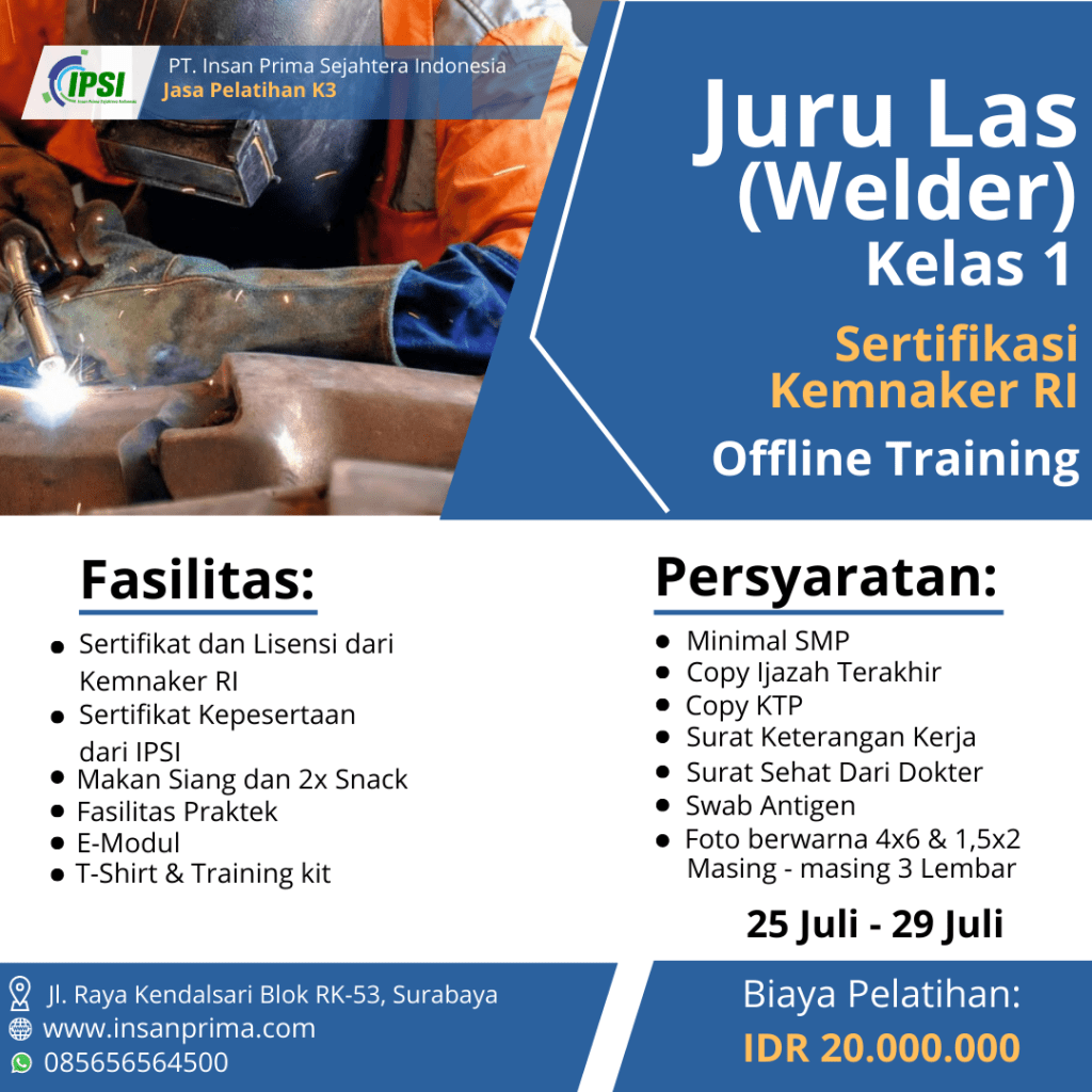 Berikut adalah jadwal kegiatan K3 Pelatihan Juru las (WELDER) Kelas 1 Sertifikasi Kemnaker RI yang kami selenggarakan.