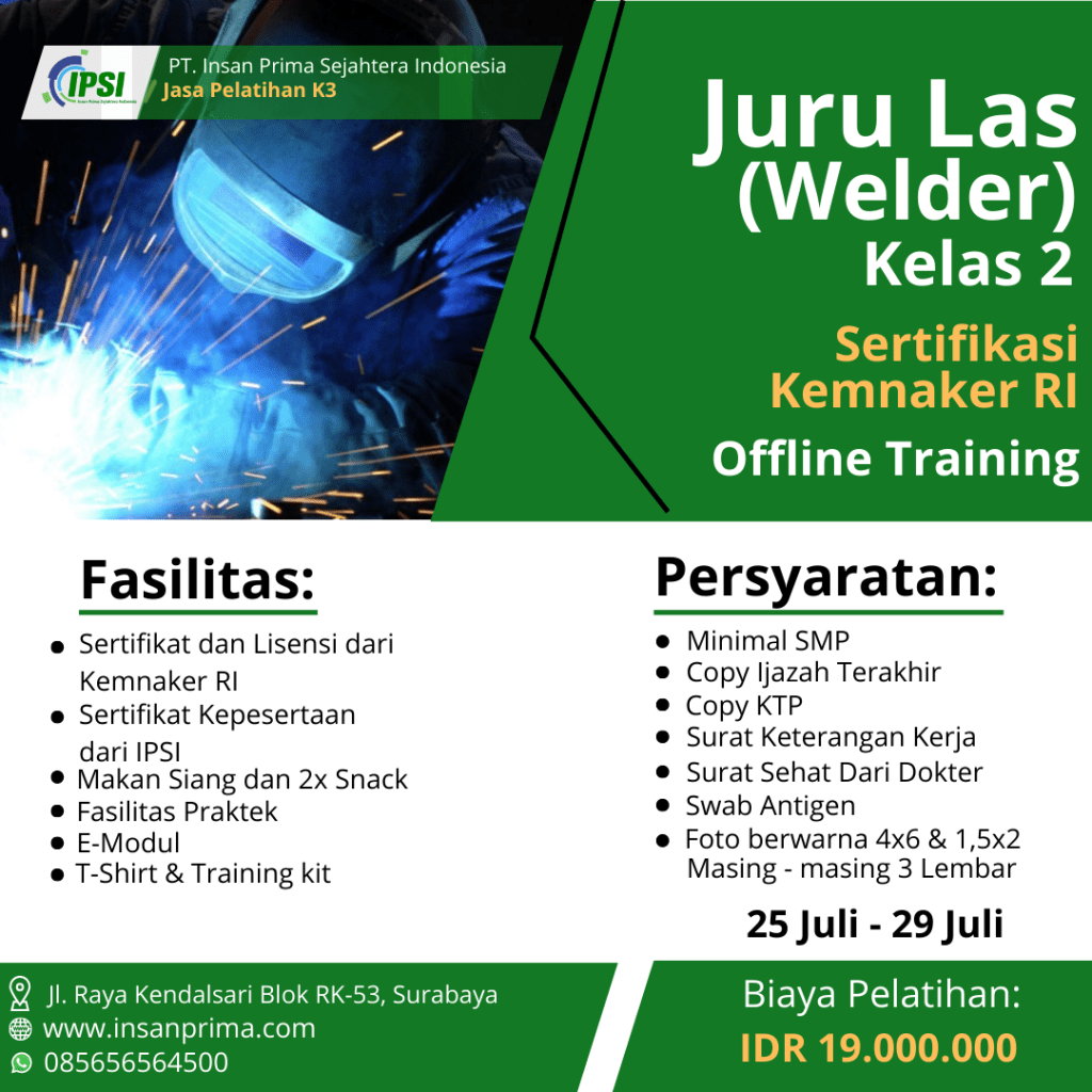 Berikut adalah jadwal kegiatan K3 Pelatihan Juru las (WELDER) Kelas 2 Sertifikasi Kemnaker RI yang kami selenggarakan.