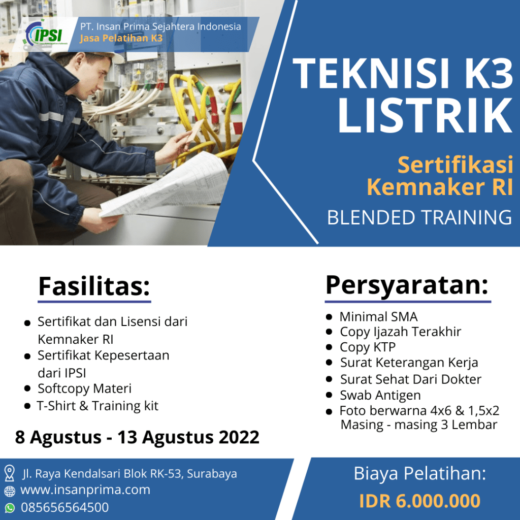 Berikut adalah jadwal kegiatan K3 Teknisi Listrik Sertifikasi Kemnaker RI yang kami selenggarakan.