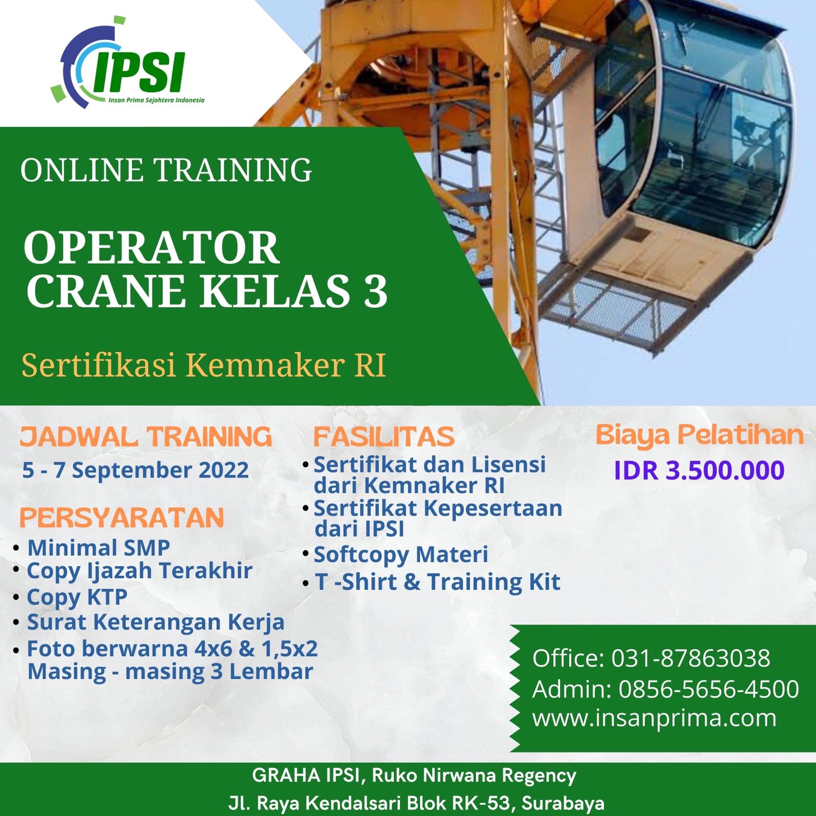 Berikut adalah jadwal kegiatan K3 Pelatihan Operator Crane Kelas 3 Sertifikasi Kemnaker RI yang kami selenggarakan.