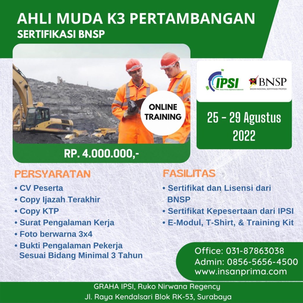 Berikut adalah jadwal kegiatan K3 Ahli Muda K3 Pertambangan Sertifikasi BNSP yang kami selenggarakan.