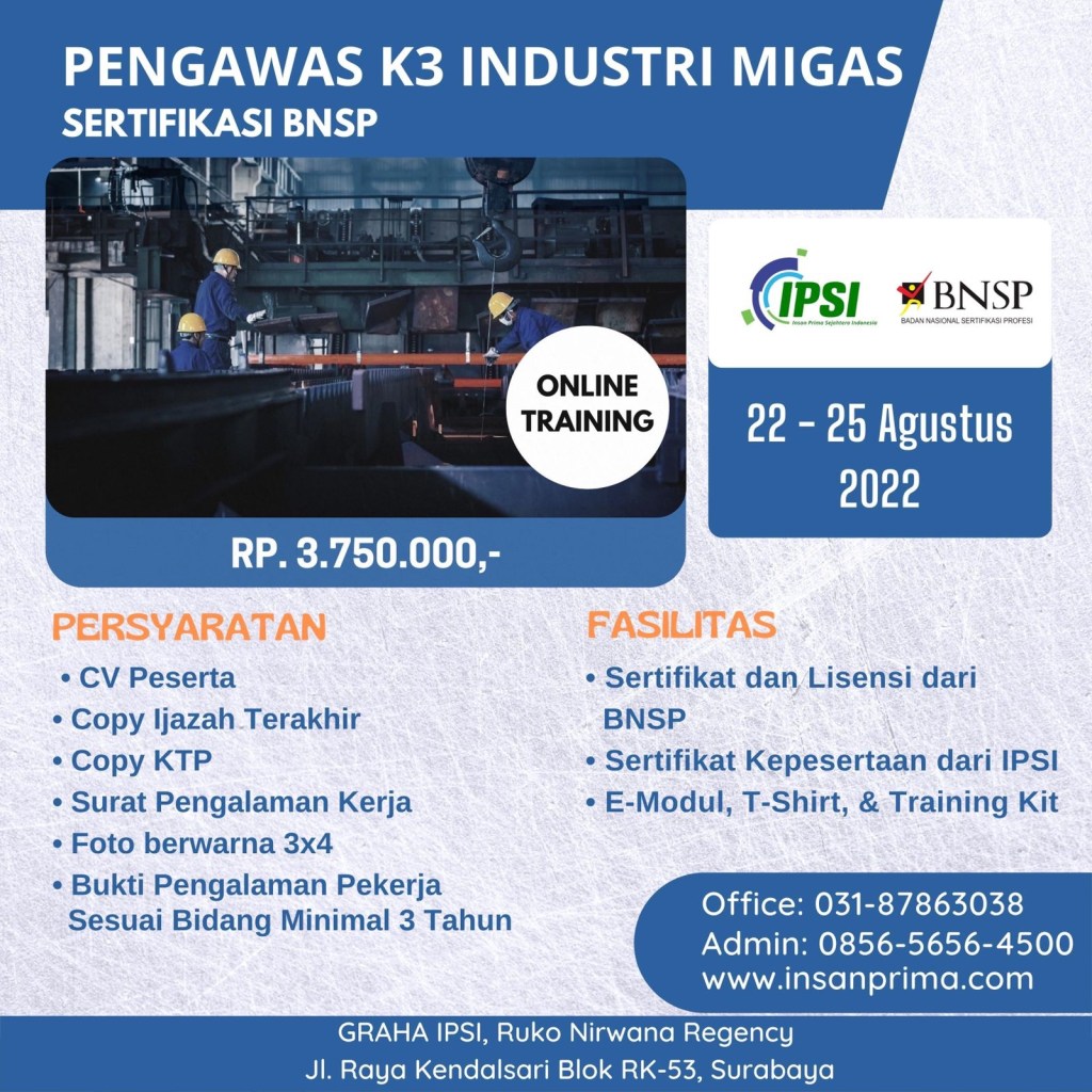 Berikut adalah jadwal kegiatan Pengawas K3 Industri Migas Sertifikasi BNSP yang kami selenggarakan.