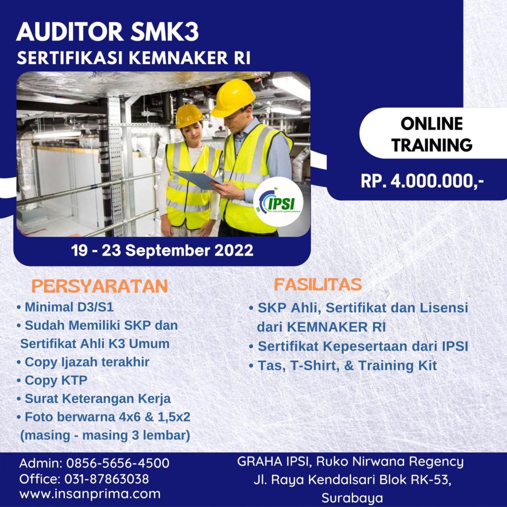 Berikut adalah jadwal kegiatan AUDITOR SMK3 Sertifikasi Kemnaker RI yang kami selenggarakan.